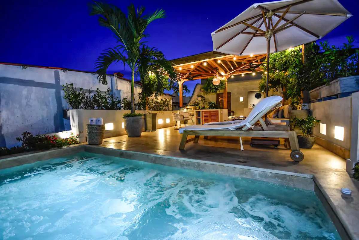 Casa Cochera’s elegant design showcases traditional colonial architecture, with high ceilings, exposed wooden beams, and large windows that flood the space with natural light. The home features four spacious bedrooms, each with air conditioning, plush bedding, and en-suite bathrooms. The master suite offers a king-size bed and direct access to a private balcony, while the other three bedrooms feature queen-size beds, ensuring a comfortable and restful stay for all.