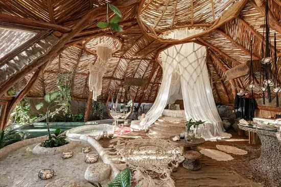 Welcome to the luxurious tree house for adults, an eco-friendly hotel with a boho lux design. For evening drinks, move to the upper floor bar where the Alice In Wonderland world awaits. A maze of handmade wooden paths twist and turn in between the treetops. Push your way through wooden hobbit style doors that open up to rooms finished with polished concrete floors and walls. Step outside into the jungle and sit in the huge ‘bird’s’ nest filled with cushions: the perfect place to gaze at the Mexican sunset, cocktail in hand.